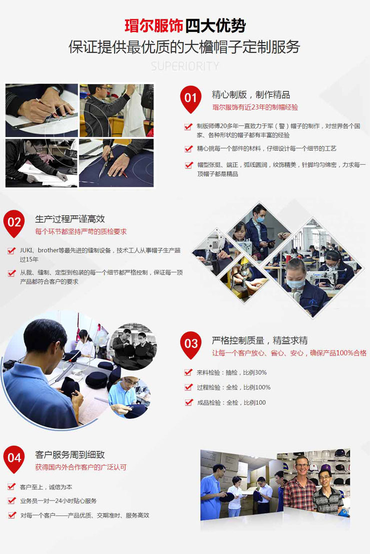 深圳市瑁爾服飾有限公司 21年專業制帽廠家,生產、定制、加工各種軍帽子、大蓋帽子、博士學士帽子、棒球帽子、高爾夫球帽子、運動帽子、平板嘻哈棒球帽子、廣告帽子、太陽帽子、貝蕾帽子、空頂帽子、漁夫帽子、空姐帽子、作訓帽子、定型帽、旅游帽等各類帽子,專業的品質,真誠的合作!