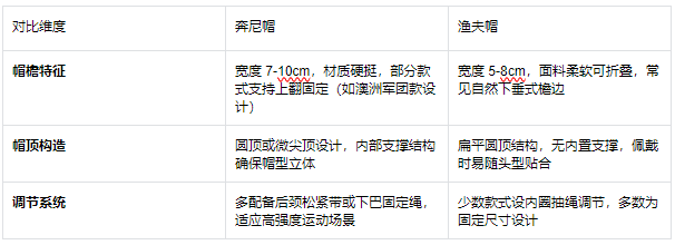 作為戶外與休閑領域的典型帽型,奔尼帽(Safari Hat)與漁夫帽(Fisherman Hat)在功能定位和設計邏輯上存在本質區別。以下從六大專業維度深入剖析兩者差異,為消費者選購及企業定制提供系統性參考。